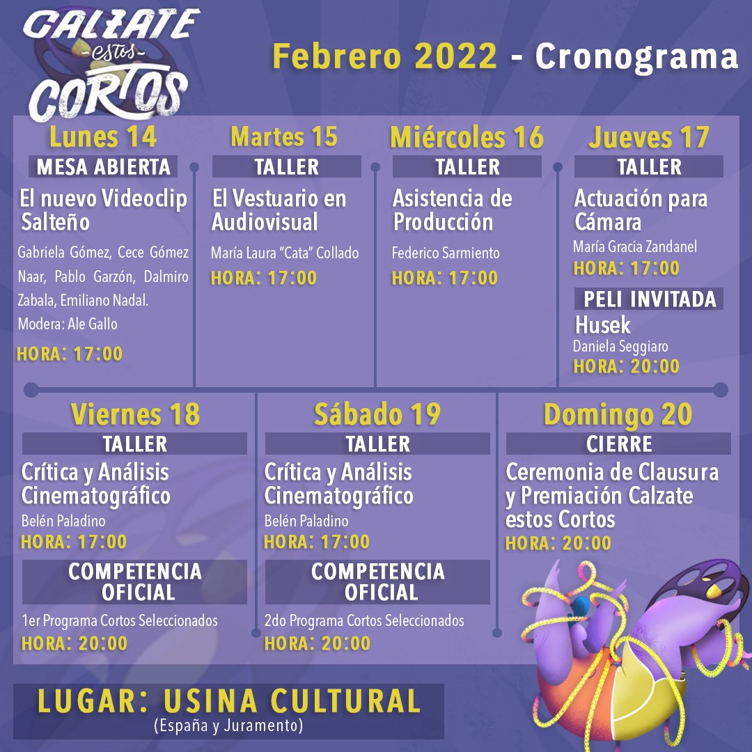Habrá no sólo competencia de cortometrajes argentinos, sino también capacitaciones, charlas, talleres y película invitada. Todas las actividades serán gratuitas y se realizarán en la Usina Cultural (España y Juramento), con el apoyo del Ministerio de Cultura de Nación (a través de su Fondo Festivales Argentinos) y de la Secretaría de Cultura de la Provincia de Salta, a través de la Dirección de Audiovisuales.