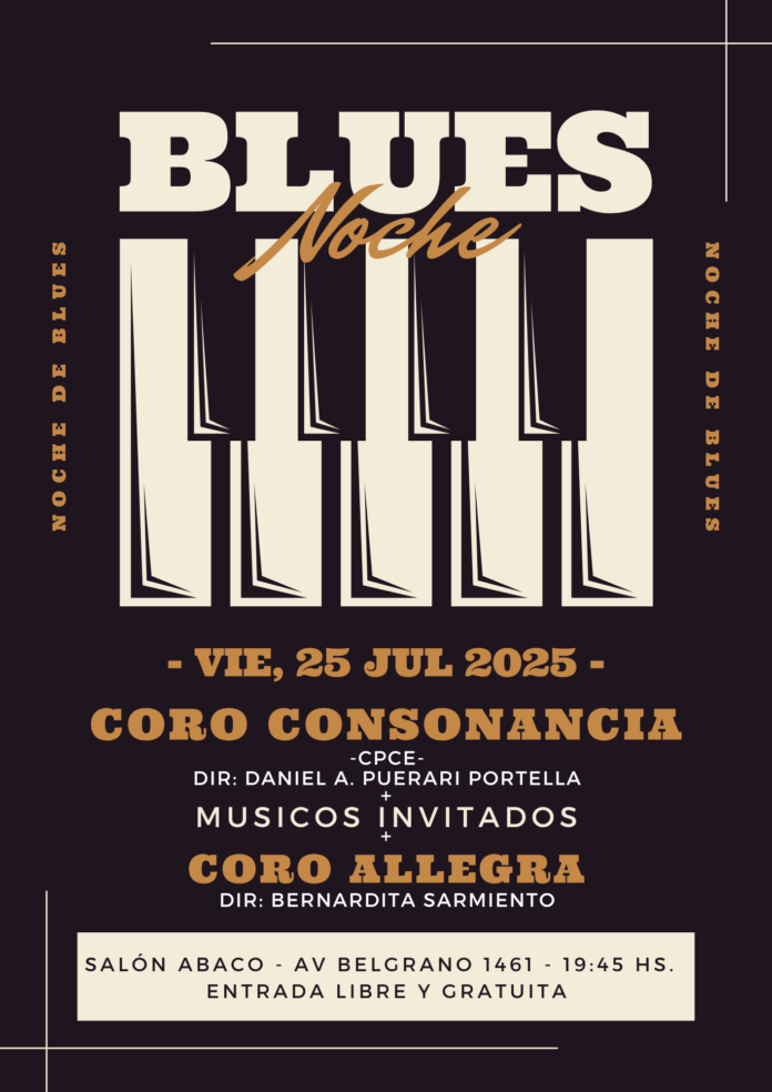 El próximo viernes 25 de julio, el Coro Consonancia, perteneciente al CPCE (Consejo Profesional de Ciencias Económicas), ofrecerá una presentación especial en el Salón Ábaco (Av Belgrano 1461) junto al Coro Allegra y destacados músicos invitados.