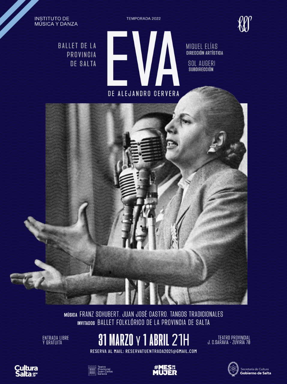 Como cierre de las celebraciones del Mes de la Mujer y en coincidencia con que este año se cumple el 70° Aniversario del fallecimiento de Eva Perón, mujer líder y figura emblemática de la historia argentina, el Ballet de la Provincia de Salta presentará EVA de Alejandro Cervera.