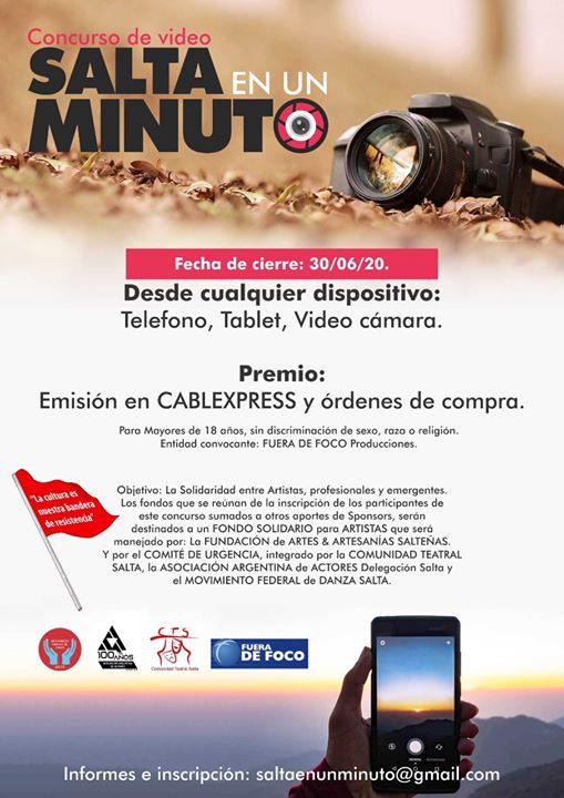 Con el objetivo específico de la solidaridad entre artistas, profesionales, y emergentes, desde Fuera de Foco, se convoca a un concurso de video, denominado: «Salta en un Minuto». Los videos podrán ser tomado desde cualquier dispositivo, ya sea: teléfono inteligente, tablet, videocámara.