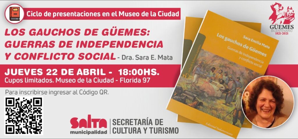 Autores salteños presentan sus libros todos los jueves a las 18 en el Museo de la Ciudad. El jueves 22 de abril será el turno de la obra “Los gauchos de Güemes: Guerras de independencia y conflicto social», de la doctora en Historia, Sara Mata.