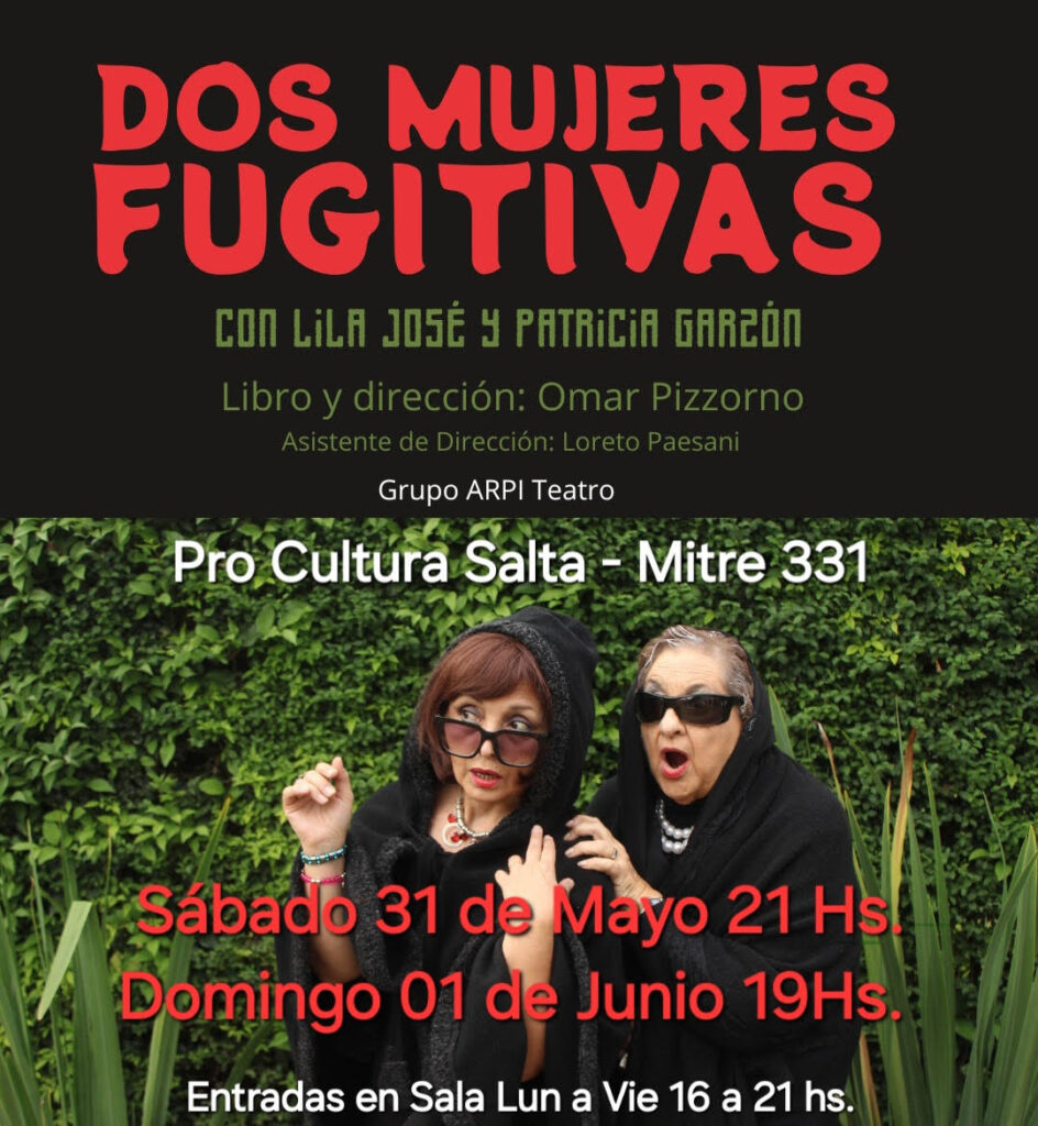 El escenario de ProCultura Salta se prepara para recibir una obra que promete emoción, ternura y carcajadas: «Dos Mujeres Fugitivas», protagonizada por Lila José y Patricia Garzón, con libro y dirección de Omar Pizzorno y asistencia de Loreto Paesani. Las funciones se realizarán el viernes 31 de mayo a las 21 hs y el sábado 01 de junio a las 19 hs en Mitre 331, sede de ProCultura. Las entradas están a la venta en la sala, de lunes a viernes de 16 a 21 hs.