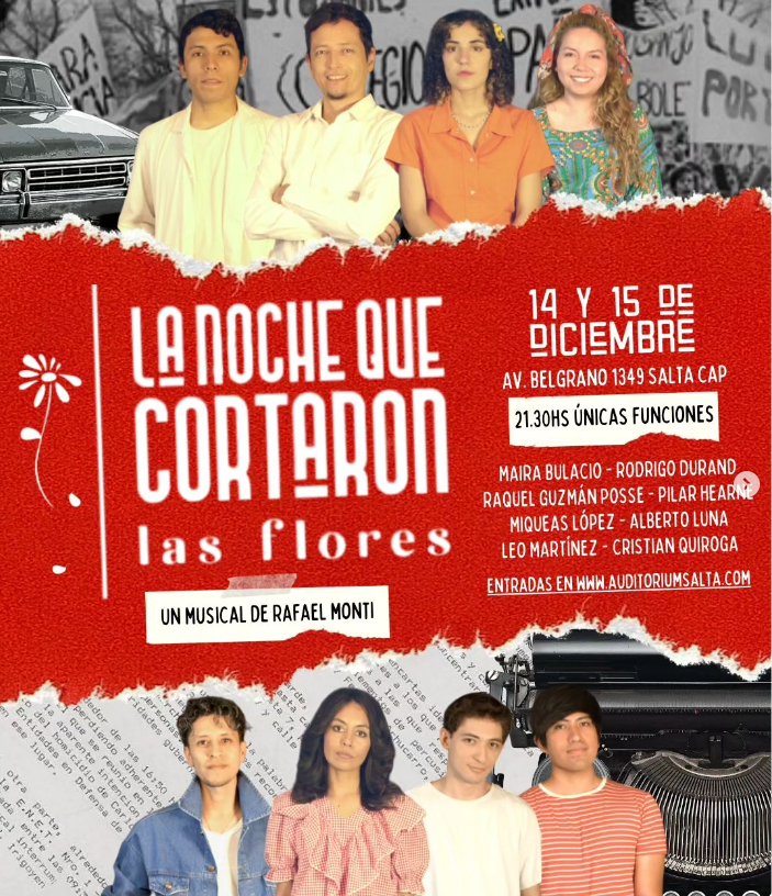 Los días 14 y 15 de diciembre, se presentará en Salón Auditorium (Avda. Belgrano 1349), a partir de horas 21.30, la obra «La Noche que cortaron las flores». Basado en el episodio de los adolescentes secuestrados en “La Noche de los lápices”.