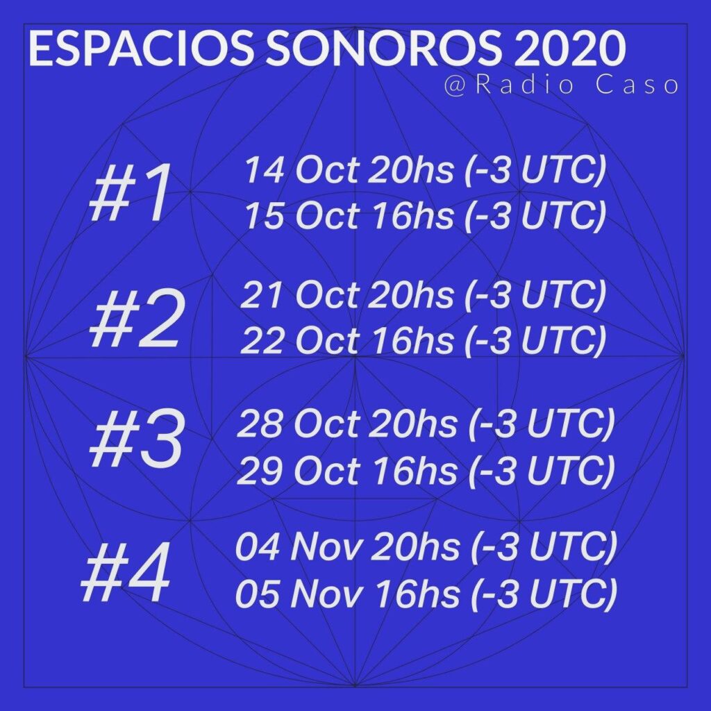 El Ciclo de Conciertos Espacios Sonoros anuncia su quinta edición por Radio CASo del Centro de Arte Sonoro del Ministerio de Cultura de la Nación, en formato virtual. Serán cuatro ediciones a partir del Jueves 14 de Octubre, todos los jueves a las 20 hs con repetición los Viernes a las 16 hs (Zona horaria Argentina).
