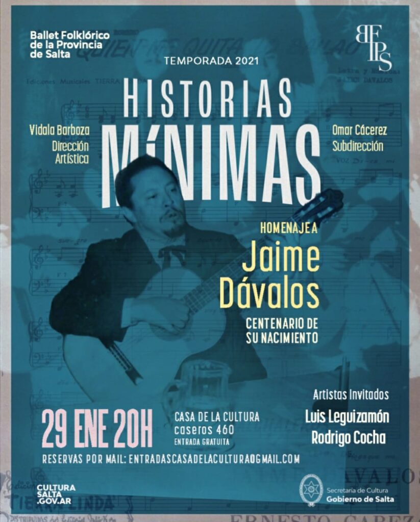 El Instituto de Música y Danza presenta al Ballet Folklórico de la Provincia General Martín Miguel de Güemes, los viernes de verano en la Casa de la Cultura, con entrada gratuita. “Historias Mínimas” pone en escena breves historias que nos identifican, interpretadas por parejas del Ballet Folklórico y cantadas y musicalizadas por artistas invitados. Cada espectáculo consiste en el abordaje de un tema en particular: la soledad, el desarraigo, la pasión, etc., que será contado a través del arte durante 30 minutos.