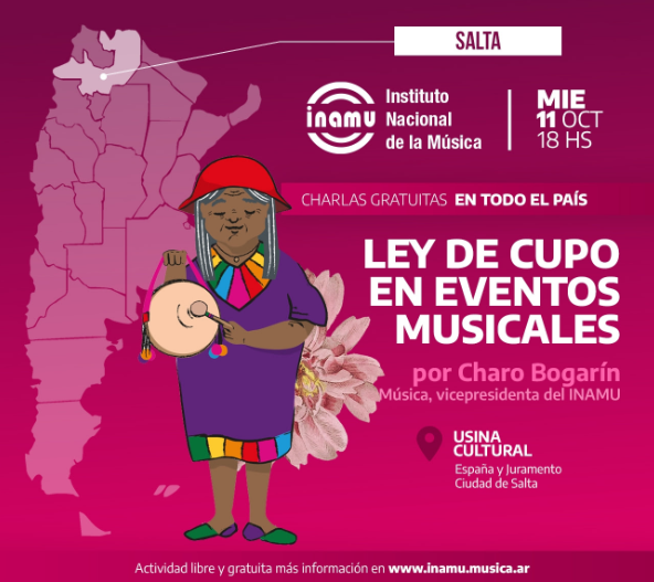 Una actividad presentada por la vicepresidenta del INAMU, Charo Bogarín, en la cual se abordará el proceso de implementación de la Ley N° 27.539, de Cupo Femenino y acceso de artistas mujeres y diversidades en eventos musicales y su aplicación en la actualidad.