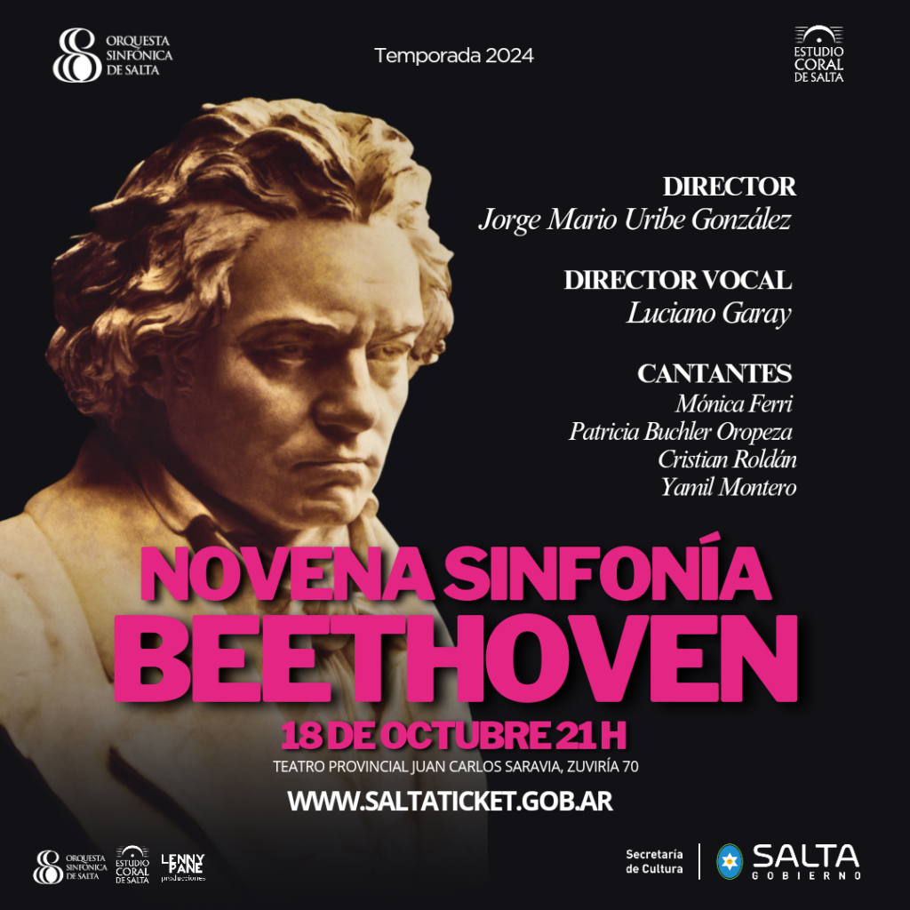 El próximo viernes 18 de octubre, el Teatro Provincial Juan Carlos Saravia será escenario de una de las obras más emblemáticas de la música clásica: la Sinfonía N° 9 «Coral», Op. 125, de Ludwig van Beethoven. Este monumental concierto será interpretado por el Estudio Coral de Salta, acompañado por la Orquesta Sinfónica de Salta y destacados solistas, bajo la dirección general del maestro Jorge Mario Uribe.