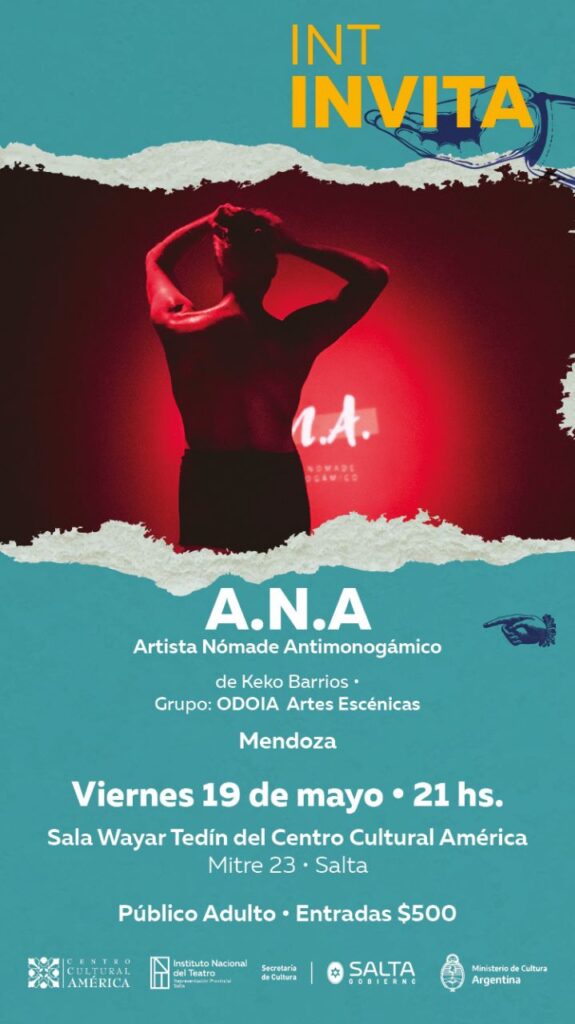 El Instituto Nacional del Teatro – Representación Salta, en cogestión con la Secretaría de Cultura de la Provincia de Salta, presentan -a través del programa «INT Invita»- el espectáculo de la provincia de Mendoza: “A.N.A. Artista Nómade Antimonogámico”, del grupo ODOIA Artes Escénicas.