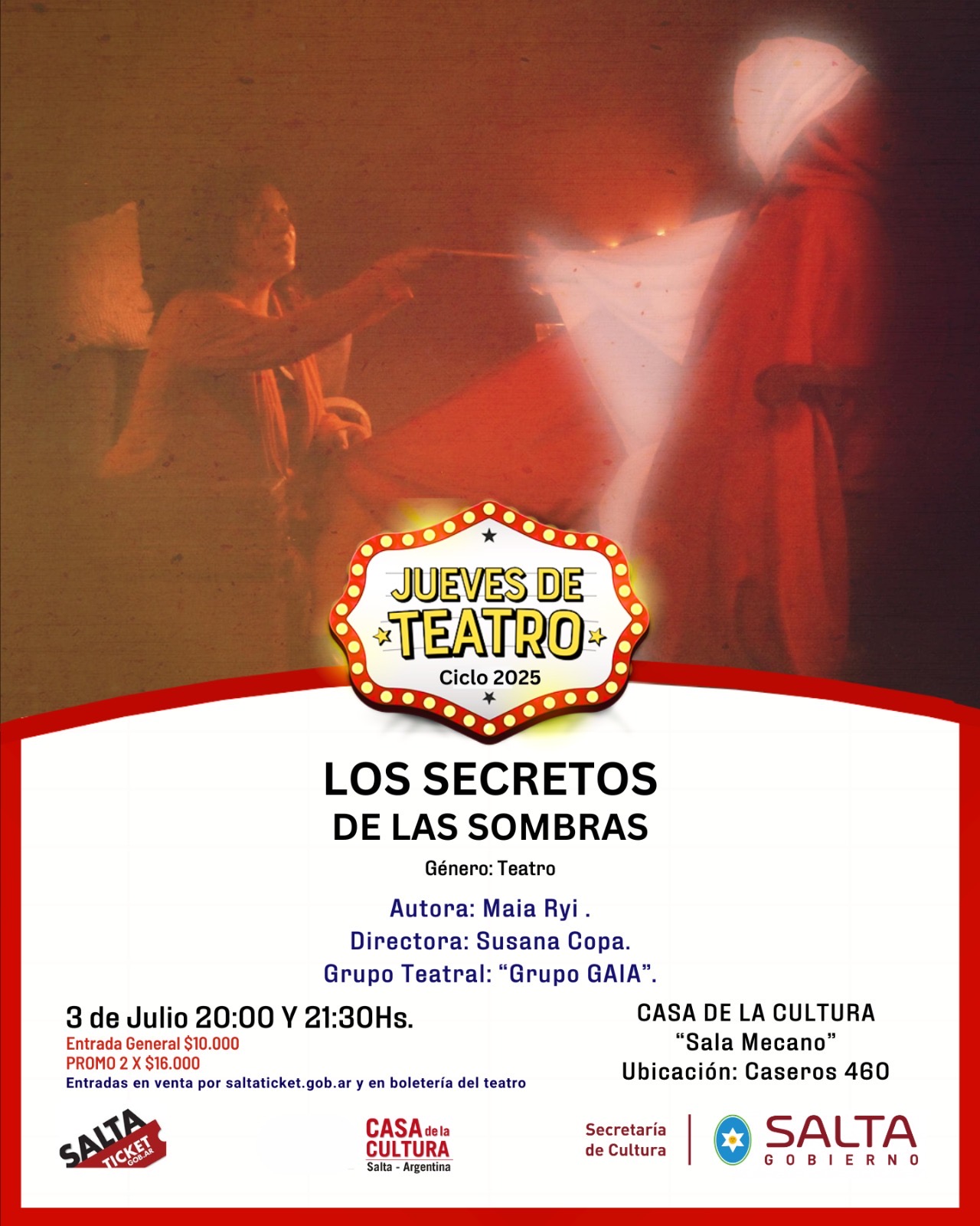 El grupo teatral «Gaia» se presenta para ofrecer una nueva obra de teatro bajo la dirección de Susana Copa; esta vez en la sala Mecano con «Los secretos de las sombras» el jueves 3 de julio a las 20 y 21:30 horas.