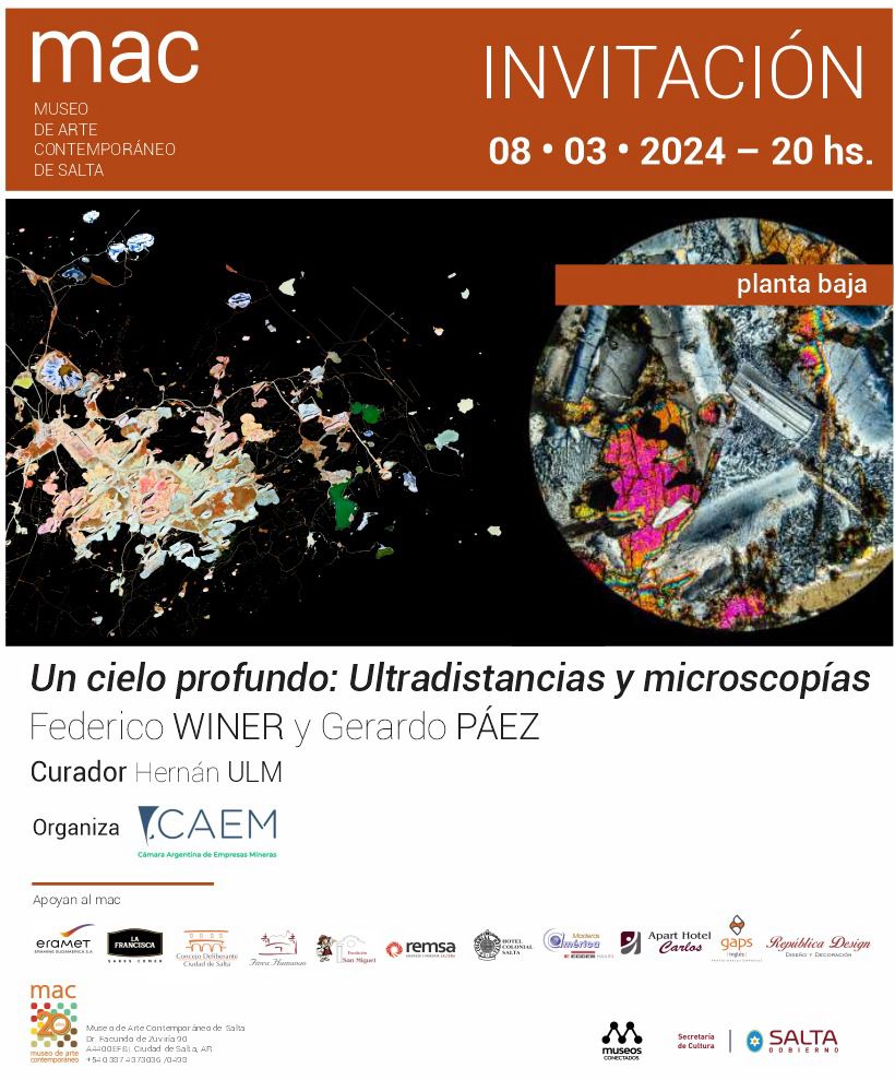CAEM organiza la muestra fotográfica “Un cielo profundo, ultradistancias y microscopías”, proyecto expositivo que nace de la voluntad de difundir en todo el país el alcance de la actividad minera en relación con las artes, en un cruce interdisciplinario que facilite la comunicación entre diferentes ámbitos de la cultura argentina. Desde miradas inéditas, Federico Winer (Ultradistancia) y Gerardo Páez (Lithos), los dos artistas que aquí exponen sus trabajos dan cuenta de las múltiples perspectivas sobre la tierra y sus manifestaciones,