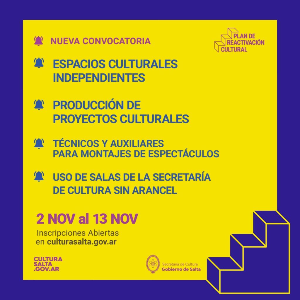 Las inscripciones estarán abiertas hasta el 13 de noviembre y podrán realizarse online en la web oficial de cultura (culturasalta.gov.ar), o personalmente en las oficias de cultura de cada municipio.