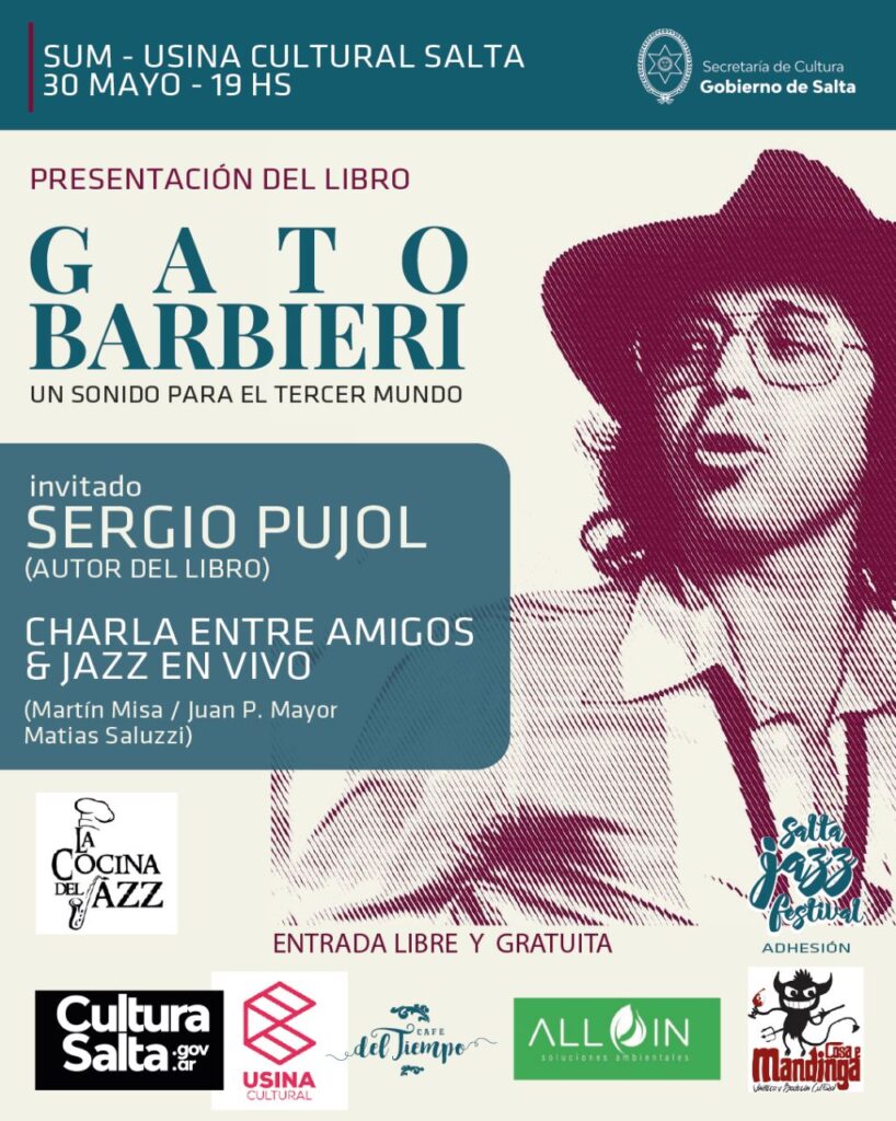 En el marco del Salta Jazz para su dècima edición, “ La Cocina del Jazz” ( FM La Plaza, 94.9 Mhz.) tiene el agrado de invitarlos a la presentación del libro “ Gato Barbieri- Un sonido para el tercer mundo” ( ed. Planeta.2022) a cargo de su autor, Sergio Pujol.